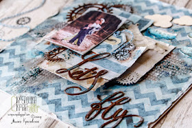 Для придания текстуры я использовала трафарет "круги" и "вещи", и два спрея: коричневый с перламутровым эффектом и лазурный. А также маленький фоновый штамп "звезды". На все материалы я, как всегда, оставлю ссылку внизу. А сейчас еще немного фото в разных ракурсах)