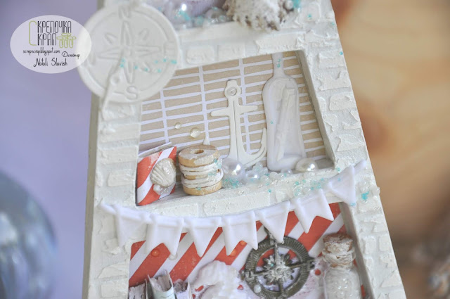 Также использовала кружево, шнур, натуральные и искусственные ракушки, чипборд, бумагу из набора "Море" и высечки и вырезалки из той же коллекции.